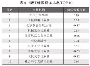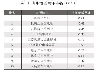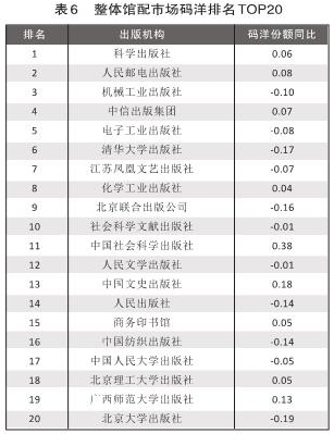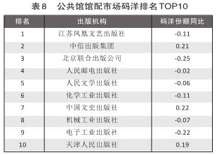 TOP50出版社中,码洋排名上升最快的是浙江文艺出版社,同比上升23个位次;码洋份额增幅最大的是中国社会科学出版社,同比增长0.38个百分点。整体馆配市场、高校馆及公共馆各自的TOP20出版社榜单中,有11家出版社在3个榜单上均有排名。高校馆TOP20出版社码洋份额合计为40.20%,同比增长0.48个百分点;公共馆TOP20出版社码洋份额合计为26.06%,同比下降0.84个百分点。(见表6~11,因版面所限,高校馆和公共馆市场排名呈现TOP10。)