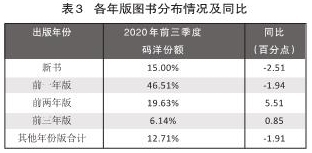 2020年前三季度参与馆配的各年版图书分布中,新书码洋份额仅15.00%,较去年同期减少2.51个百分点;各年版图书分布规律与往年相比变化不大,前一年版(2019年版)依然占据主力位置,码洋份额达到46.51%,同比下降1.94个百分点;码洋居次席的是前两年版(2018年版)图书,码洋份额为19.63%,码洋份额同比增加5.51个百分点;前三年版(2017年版)图书码洋份额也比去年同期有所增长。从单册平均价格来看,新书占据首位,为58.87元/册,2019年同期该项指标数值为56.83元/册,同比增长3.59%;前一年版图书单册平均价格为58.43元/册,同比增长6.15%。(见表3)