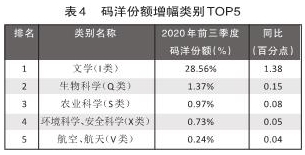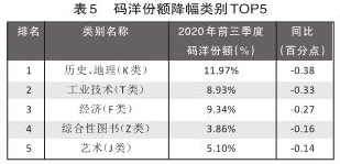 整体来看,2020年前三季度馆配市场中社科类(A~K)图书码洋份额为75.58%,同比增长0.17个百分点;自科类(N~X)图书码洋份额为22.73%,同比下降0.13个百分点。(表4、5分别为码洋份额增幅TOP5类别和降幅TOP5类别。)