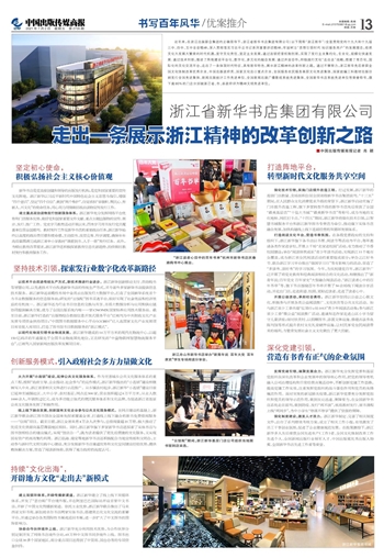 近年来,在浙江出版联合集团的正确领导下,浙江省新华书店集团有限公司(以下简称“浙江新华”)全面贯彻党的十九大和十九届三中、四中、五中全会精神,深入贯彻落实习近平总书记系列重要讲话精神,牢固树立“思想引领时代 知识服务用户”的发展理念,抢抓文化大发展大繁荣的时代机遇,坚守文化责任、坚定主业发展,通过连锁经营机制创新,实现了发行主业集约化、专业化、规模化快速发展;通过技术创新,推进了阵地建设平台化、数字化、多元化的融合发展;通过开放合作,积极践行文化“走出去”战略,搭建了常态化、国际化的文化交流平台,走出了一条体现时代特征、具有新华特色、展示浙江精神的改革创新之路。通过不懈努力,浙江新华先后荣获全国文化体制改革优秀企业、中国出版政府奖、国家文化出口重点企业、全国服务农民服务基层文化先进集体、国家统编三科教材出版印刷发行全国先进集体、新闻出版统计工作先进单位、全国新闻出版广播影视系统先进集体、全国新华书店系统先进单位等荣誉称号,旗下逾80%的门店分别被浙江省、市、县政府评为精神文明先进单位。