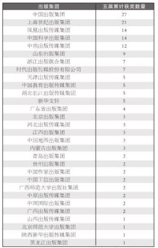 第五届中国出版政府奖评选中,出版集团凭借硬实力在各类奖项中斩获颇多,这是出版集团坚持各自的特色道路、坚守出版主业定力而结出的硕果。具体从出版集团获图书奖正奖五届合计数量来看,中国出版集团以27项高居榜首,上海世纪出版集团以21项位列第二,凤凰出版传媒集团与中国科学出版集团以14项并列第三(见附表)。
