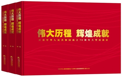 《伟大历程 辉煌成就——庆祝中华人民共和国成立70周年大型成就展》共分三卷,包括精装、平装两个版本。全套书以时间为轴线,选取近1200条事件、2000多幅图片,生动再现了新中国成立以来70年的重要时刻、精彩瞬间,是加强党史、新中国史、改革开放史、社会主义发展史学习教育,深化中国特色社会主义和中国梦宣传教育的生动读本。
