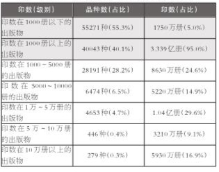 印数在1000册以下的出版物有5.5271万种,占比达55.3%(见表5)。500册以下、500~1000册两个印数级别主要为指导性出版物、规范类出版物以及学术出版物等;1000~5000册印数级别主要包括科普出版物、中等专业教育和高等教育的教科书与教参,以及大部分严肃文学作品;5000~10000册印数级别包括侦探小说、幻想小说、爱情小说和感伤小说,以及各类字典和指南等。随着按需印刷技术的日益推广,未注明印数的出版物品种数也不断增加。
