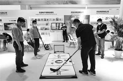 为迎接2022年北京冬奥会,河北展区特别设计了冬奥会比赛项目冰壶运动演示区,这是由河北出版传媒集团方圆电子音像出版社提供的专业智能冰球运动训练系统,吸引不少观众前来“打卡”。