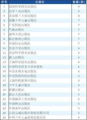25家出版社入选作品不低于5部,进入第二方阵(见表2)。除湖南科学技术出版社、化学工业出版社等科技类出版社、综合社外,北京理工大学出版社、清华大学出版社、北京大学出版社、中国科学技术大学出版社、中国海洋大学出版社5家大学社也显示了较强实力。25家出版社总计入选155部作品,总占比超28%。