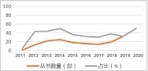从分类看,丛书这类大部头作品由于分量重、内容全、价值高,始终是专家评议推荐时的偏爱(见图1)。10年来,丛(套)书入选共210部,总占比达38%。从数量和占比上看,2011年只有1部丛书入选,之后呈逐年上升趋势,2014年入选25部,占当年全部入选作品的50%,之后连续3年入选数量缓慢下降。2017年,科技部专门在推荐标准中添加一项,要求所荐“丛书应为全部出版完成的作品,不接受丛书中的单册或部分作品”,而此后推荐作品中的丛书入选数量又复抬升,2020年占比再达5成共入选50部。