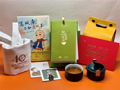 2021年恰逢花城出版社成立40周年、鲁迅诞辰140周年,为此花城社推出“花城40周年精品文创”新年礼盒。该礼盒包含菜菜美食日记《2022好食光日历》、一禅小和尚《等风来,不如追风去》、鲁迅·藏书票、鲁迅·帆布袋、花城社定制茶具和2022贺年卡。据花城出版社编辑陈诗泳介绍:“这是我社第一次推出‘新年礼盒’,礼盒中的礼品都是花城社的重点产品,兼具文艺性和实用性,后续花城社将继续推出鲁迅等系列文创产品。”