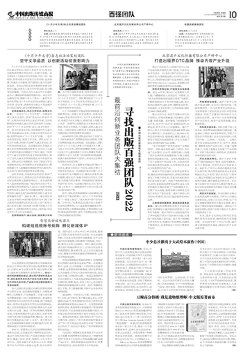 中国出版传媒商报近年持续发起“寻找出版百强团队”推展活动,希望通过挖掘和点亮出版行业中的优秀品牌和团队,让更多在书业耕耘的具有创新力、创造力和执行力的战队,从幕后走到台前,分享制胜法宝和技能。