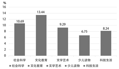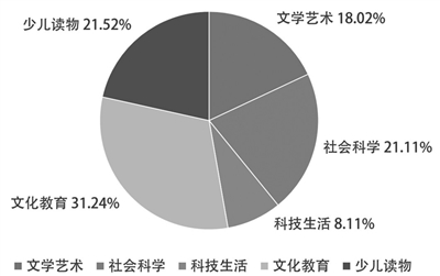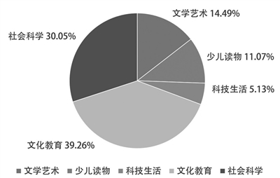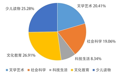 当月,线上市场的销售结构(见图4)是:文化教育书份额最大,占比26.91%,比重较上月缩小0.81个百分点;少儿读物份额次之,占比25.28%,比重较上月缩小3.90个百分点;文学艺术书份额居中,占比20.41%,比重较上月扩大2.49个百分点;社会科学书份额第四,占比19.06%,比重较上月扩大0.49个百分点;科技生活书份额最小,占比8.34%,比重较上月扩大1.74%个百分点。与上月比较,除科技生活书份额位序不变外,文化教育书和少儿读物份额位序交换,文学艺术书和社会科学书份额位序交换。份额居前两位的文化教育书和少儿读物,比重较上月缩小;份额继后的文学艺术书、社会科学书、科技生活书,比重较上月扩大。