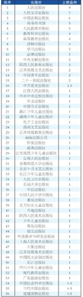 综合线下、线上市场两个TOP100,按出版社上榜图书频次排列,人民教育出版社以14种(次)居首位;人民文学出版社以12种(次)列第2位;人民出版社以10种(次)列第3位;教育科学出版社以8种(次)列第4位;商务印书馆以7种(次)列第5位。其中人民文学出版社在线下、线上市场上榜品种分别列第2位,两个市场的平均位序居首位。