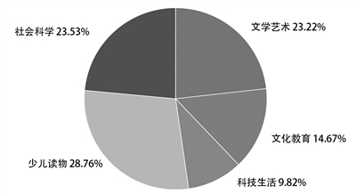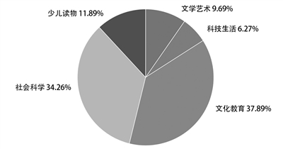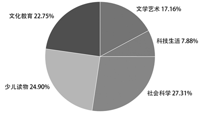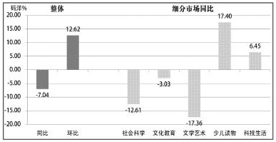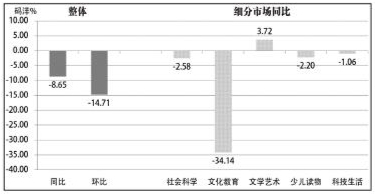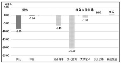 各细分市场表现不一,文学艺术书是唯一规模增长的细分市场,销售同比增长3.72%。其余四类细分市场规模均下滑,尤以文化教育书细分市场最甚,销售同比下降34.14%;社会科学书细分市场和少儿读物细分市场降幅接近,前者销售同比下降2.58%,后者销售同比下降2.20%;科技生活书细分市场销售同比下降1.06%。