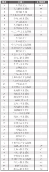 综合图书零售市场线下、线上两个TOP100,按出版社上榜图书频次排列,人民出版社以17.2种(次)列第1位;高等教育出版社以15种(次)列第2位;外语教学与研究出版社以10种(次)列第3位;商务印书馆、北京联合出版公司分别以9种(次),并列第4位。