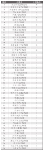 图书零售线上市场TOP100图书,分属58家出版社(见表4),其中中央出版社26家,地方出版社32家。上榜品种最多的是北京联合出版公司,共8种书上榜;北京十月文艺出版社次之,6种书上榜;外语教学与研究出版社、人民文学出版社等4家出版社,各4种书上榜;湖南文艺出版社、中信出版社等4家出版社,各3种书上榜;机械工业出版社、译林出版社等10家出版社,各2种书上榜;新疆青少年出版社、中央编译出版社等38家出版社,各1种书上榜。
