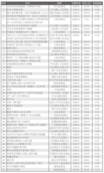 表5 2022年10月当年新书热销TOP50(按销量降序排列)