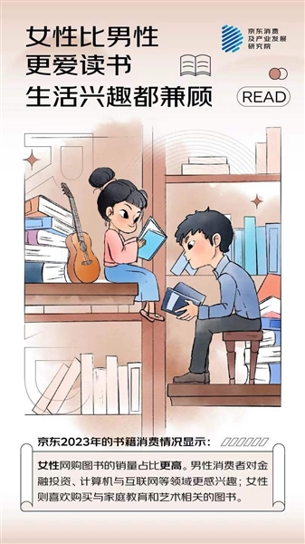 随着女性教育水平、收入水平的提升,女性对自身学习发展、家庭教育等方面的要求越来越高。根据京东销售情况统计显示:女性网购图书的销量占比53%,比男性高6个百分点。