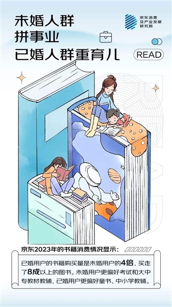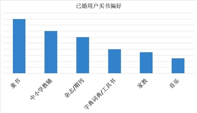 婚后,读者购书的重心发生变化,已婚用户在童书、中小学教辅、家教等品类的消费占比高于整体,教育下一代成为网购图书的首要出发点。