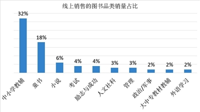 京东的销售情况显示:2023年图书类销量占比最高的是教辅和考试类书籍,占40%,其中,中小学教辅书占32%。此外,童书占18%,小说、励志与成功、人文社科类图书占3%~6%。