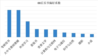 从不同年龄段读者网购图书的偏好来看,00后读书的主要动力在满足考研需求。他们在考研用书、大中专教材教辅、外语学习类图书的消费偏好最高,同时也爱买青春文学、摄影图书和小说。