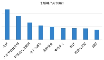 已婚用户的书籍购买量是未婚用户的4倍,买走了8成以上的图书。从品类偏好来看,未婚用户网购考试、教辅书、计算机等专业书的占比高于整体,读书主要是为了拼事业和前程。