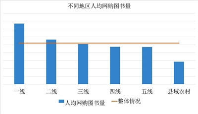 不同地区网购图书的表现存在明显的差异。一线城市人均网购图书量比全国均值高8.8%,二线城市人均网购图书量比全国均值高1.6%,三至五线城市网购图书量略低于全国均值,县域农村人均网购图书量比全国均值低8.8%。