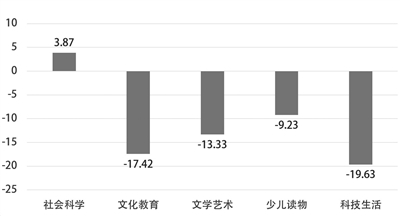 上半年,图书零售各细分市场,除社会科学书细分市场销售同比增长3.87%外(见图2),其余各细分市场销售均同比下降:除少儿读物细分市场以9.23%的一位数降幅,同比回落外,其余三类细分市场均呈两位数同比回落,文化教育书细分市场销售同比下降17.42%,文学艺术书细分市场销售同比下降13.33%,科技生活书细分市场销售同比下降19.63%。社会科学书细分市场销售同比增长,主要得益于学习贯彻习近平新时代中国特色社会主义思想主题教育相关读物的热销。