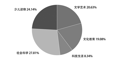 上半年,图书零售市场的销售结构(见图3)是:社会科学类份额最大,占比27.81%,比重同比扩大5.11个百分点;少儿读物类份额次之,占比24.14%,比重同比缩小0.25个百分点;文学艺术类份额居中,占比20.63%,比重同比扩大0.19个百分点;文化教育类份额第四,占比19.08%,比重同比缩小4.27个百分点;科技生活类份额最小,占比8.34%,比重同比缩小0.51个百分点。与去年同期比较,除科技生活类份额位序不变外,其余四类份额位序均发生变化:社会科学类、文学艺术类份额位序前移,前者份额位序同比前移两位,后者份额位序同比前移一位。少儿读物类、文化教育类份额位序后移,前者份额位序同比后移一位,后者份额位序同比后移两位。同比去年,除了社会科学类比重扩大5个多百分点,文化教育类比重缩小4个多百分点外,其余门类比重变化均不足1个百分点。社会科学类份额最大,份额位序前移两位,与其是唯一销售同比增长的门类相吻合,原因一致。