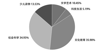 上半年,图书零售线下市场的销售结构(见图5)是:文化教育类份额居首,占比35.90%,比重同比缩小2.79个百分点;社会科学类份额次之,占比34.93%,比重同比扩大5.51个百分点;少儿读物类份额居中,占比13.53%,比重同比扩大0.58个百分点;文学艺术类份额第四,占比10.45%,比重同比缩小1.94个百分点;科技生活类份额最小,占比5.19%,比重同比缩小1.36个百分点。与去年同期比较,各类别市场份额份序不变,社会科学类、少儿读物类比重扩大,其余三类比重缩小。