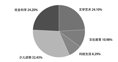 上半年,图书零售线上市场的销售结构(见图7)是:少儿读物类份额最大,占比32.43%,比重同比扩大4.14个百分点;社会科学类份额第二,占比24.20%,比重同比扩大2.32个百分点;文学艺术类份额居中,占比24.10%,比重同比扩大0.75个百分点;文化教育类份额第四,占比10.98%,比重同比缩小5.08个百分点;科技生活类份额居末,占比8.29%,比重同比缩小2.13个百分点。与上年比较,少儿读物、文化教育、科技生活三类份额位序不变,社会科学、文学艺术两类份额位序互换。