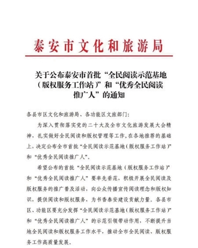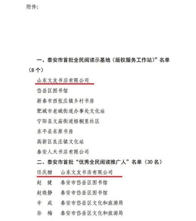 副会长单位——山东文友书店有限公司荣获泰安市首批“全民阅读示范基地(版权服务工作站)”,荣获2022山东文旅新锋尚“十佳网红书店”荣誉称号;公司董事长任庆酣荣获“优秀全民阅读推广人”。