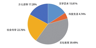 2月份,图书零售线下市场的销售结构(见图4)是:文化教育类份额居首,占比39.49%,比重同比扩大0.80个百分点,环比扩大4.52个百分点;社会科学类份额次之,占比22.76%,比重同比缩小9.45个百分点,环比缩小1.36个百分点;少儿读物类份额居中,占比17.20%,比重同比扩大5.76个百分点,环比缩小4.14个百分点;文学艺术类份额第四,占比15.81%,比重同比扩大3.12个百分点,环比扩大1.76个百分点;科技生活类份额居末,占比4.74%,比重同比缩小0.23个百分点,环比缩小0.78个百分点。与去年同期比较:少儿读物类和文学艺术类份额位序互换;其他类份额位序不变。社会科学类比重变化最大,缩小近10个百分点。与整体市场一样,市场化程度高的少儿读物类和文学艺术类比重分别扩大,且销售降幅较小,显示了线下市场与整体市场销售态势的高度契合。