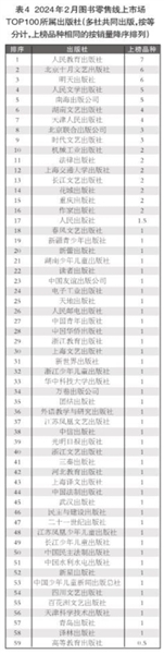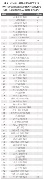 2月份,图书零售线上市场热销TOP100图书分属59家出版社(见表4)。其中,中央出版社23家、地方出版社36家。上榜图书最多的是人民教育出版社,共7种书上榜;北京十月文艺出版社、明天出版社次之,各6种书上榜;人民文学出版社、南海出版公司,各5种书上榜;湖南文艺出版社、天津人民出版社,各4种书上榜;北京联合出版公司、时代文艺出版社,各3种书上榜;法律出版社、上海交通大学出版社等7家出版社,各2种书上榜;人民出版社1.5种书上榜;春风文艺出版社、新疆青少年出版社等41家出版社,各1种书上榜;高等教育出版社0.5种书上榜。