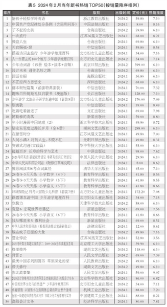 2月份,以《陪孩子轻松学好英语》领衔的当年新书多有不俗表现,新书热销TOP50(见表5)分属30家出版社,其中中央出版社17家,地方出版社13家,15种当月新书入列。北方妇女儿童出版社以6个品种,台海出版社、教育科学出版社分别以4个品种晋入,显示了各自开年新书契合市场需求。