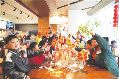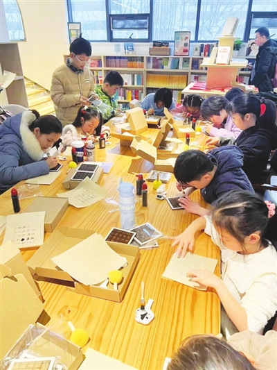 寒假期间,武汉市新华书店开展了“银杏叶玫瑰手捧花制作”“漫画党史知识竞赛”“好运投壶”“元宵花灯——非遗文化DIY制作”等活动,并重点引入“古风竹枝制滚灯制作”“掐丝珐琅书签制作”“线装书线下文化制作体验”“古法造纸”“ 活字印刷”“刻版拓印”“纸浆画制作”等非遗元素。武汉市新华书店运营管理部王瑄表示,武汉市新华书店以“文化体验研学营”模式,带领学员们在全方位、立体式、体验式的研学活动中,体验手作技艺,培养动脑动手能力,学习非遗传统文化。
