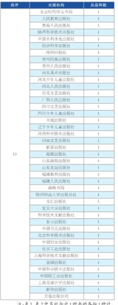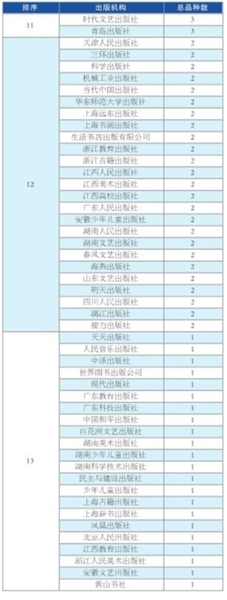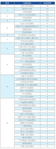 北京出版集团位列第四位,有21种入选图书。该集团旗下的北京十月文艺出版社凭借12种文学艺术类入选图书的优势,高于北京出版社、北京少年儿童出版社、北京人民出版社3家的入选品种总和。