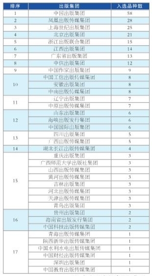 位列第二名的是凤凰出版传媒集团28种,该集团除了2017年度缺席外,每年度都有图书入选。凤凰集团旗下7家出版社中入选最多的是江苏凤凰文艺出版社8种,其次是江苏人民出版社5种,江苏凤凰科学技术出版社和江苏凤凰少年儿童出版社分别是4种。