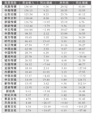 净利润不足亿元的有果麦文化、读者传媒、世纪天鸿、新华传媒、掌阅科技、中文在线、读客文化、荣信文化、天舟文化等9家公司。