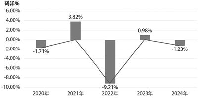 回望2020年疫情以来的5年,图书零售市场规模呈螺旋式发展(见图1):2020年市场规模同比下降1.71%;2021年市场规模同比上升3.82%;2022年市场规模同比下降9.21%;2023年市场规模同比上升0.98%;2024年市场规模同比下降1.23%。5年市场发展的历程为三年降、两年升,可谓曲折艰辛、喜忧交织。