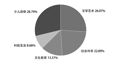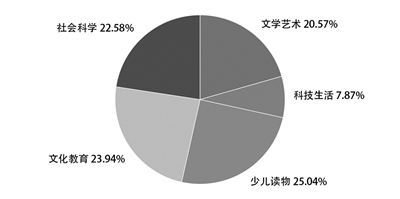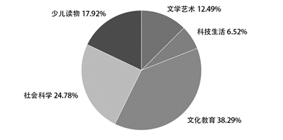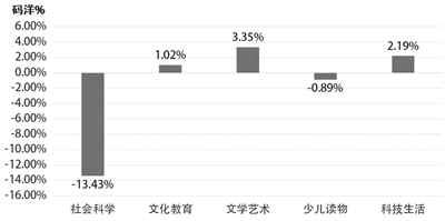 当年,线上细分市场规模呈两增三减(见图7):文学艺术书细分市场规模和文化教育书细分市场规模扩大,前者销售同比增长4.02%,后者销售同比增长1.04%。社会科学书细分市场规模较大幅缩小,销售同比下降12.07%;少儿读物细分市场规模缩小,销售同比下降7.89%;科技生活书细分市场规模缩小,销售同比下降2.61%。