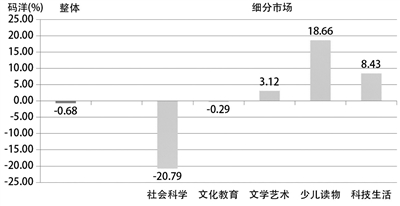 当年,线下细分市场规模呈三增两减(见图5):少儿读物细分市场规模明显扩大,销售同比增长18.66%;科技生活书细分市场规模扩大,销售同比增长8.43%;文学艺术书细分市场规模扩大,销售同比增长3.12%。社会科学书细分市场规模明显缩小,销售同比下降20.79%;文化教育书细分市场规模缩小,销售同比下降0.29%。