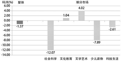 年度收官的12月份,市场态势未尽如人意,销售数量同比下降3.09%,销售码洋同比下降2.42%。由此导致第四季度销售数量同比下降1.62%,销售码洋同比下降0.98%,最终造成年度市场规模微幅回落。