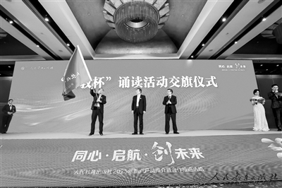 现场还举行了“典耀中华——第六届‘人教杯’诵读活动”交旗仪式,诵读活动的旗帜由2024年的共同举办方江西省出版传媒集团传递给今年的共同举办方重庆新华出版集团。该活动为人教社与全国各省出版发行集团共同打造的知名文化教育品牌,已成功举办5届,现已成为传播中华优秀传统文化、弘扬革命文化和社会主义先进文化的优质平台。