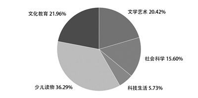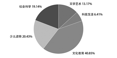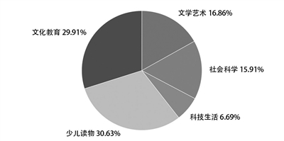 2月份,图书零售市场的销售结构(见图2)是:少儿读物类市场份额最大,占比30.63%,比重同比扩大3.92个百分点,环比扩大3.27个百分点;文化教育类市场份额次之,占比29.91%,比重同比扩大7.67个百分点,环比扩大5.67个百分点;文学艺术类市场份额居中,占比16.86%,比重同比缩小4.60个百分点,环比缩小3.82个百分点;社会科学类市场份额第四,占比15.91%,比重同比缩小6.88个百分点,环比缩小4.30个百分点;科技生活类市场份额最小,占比6.69%,比重同比缩小0.11个百分点,环比缩小0.82个百分点。与去年同期比较:文化教育类、文学艺术类市场份额位序分别前移1位;社会科学类市场份额位序后移2位;其他类别市场份额位序不变。除科技生活类外,其他四类比重变化均较大:文化教育类和社会科学类比重分别扩大或缩小逾5个百分点;少儿读物类和文学艺术类比重分别扩大或缩小逾3个百分点。少儿读物类和文化教育类市场份额接近,文学艺术类和社会科学类市场份额接近,相差分别不足1个百分点。少儿读物类和文化教育类不但高居市场份额前两位,还分别比重较大幅扩大,销售大幅增长,凸显了二者作为市场刚需品类,对当月市场上扬的贡献。