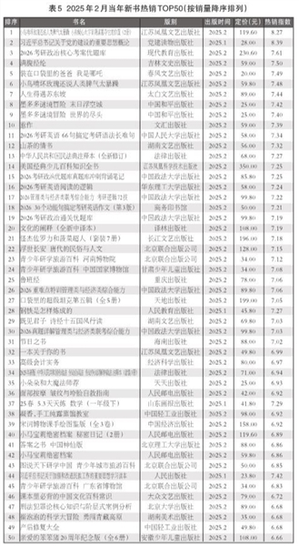 2月份,以《小鸟啃坏玫瑰还说人类脾气太暴躁 小狗疑心大宇宙阴谋篡夺它的位置》为领衔的当年新书,表现非凡。特别是当月出版上市的最新品,有46个品种晋入当年新书热销TOP50(见表5),占比逾9成。当年新书热销TOP50,分属35家出版社,同比增加5家,环比增加7家。其中,中央出版社17家,地方出版社18家。中国政法大学出版社以5个品种晋入,北京联合出版公司以4个品种晋入,江苏凤凰文艺出版社、人民邮电出版社分别以3个品种晋入,彰显了各自开年新书广为读者青睐。
