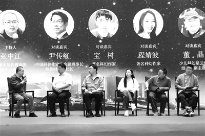 参与圆桌对话的有中国科普作家协会副理事长、科普时报社社长尹传红,全球华语科幻星云奖联合发起人、时光幻象公司总经理董晶,四川大学文学与新闻学院副研究员姜振宇,以及两位著名科幻作家宝树和程婧波。