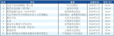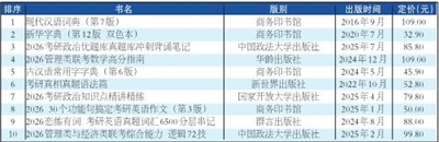 榜单快评 反映新学年开学季图书市场热销态势的本期榜单,“时令性”凸显:文化教育书热销TOP20全部为学生热逐用书。其中90%系对上期的更新品种,9个品种晋入全品类图书热销TOP20。商务印书馆的经典语言工具书《现代汉语词典》不但重展雄风,斩获领衔书桂冠,还冲上全品类图书热销榜眼位,并携本家同类经典《新华字典》《古汉语常用字字典》《牛津高阶英汉双解词典》联袂晋入。《2026考研政治优题库真题库冲刺背诵笔记》《2026管理类联考数学高分指南》《考研真相真题语法篇》等9家出版社的14种考研书,竞相晋入,其中大多为当年出版的新品。另两个品种《新视野大学英语 读写教程1》和《中国近现代史纲要》,也分别为大学用书。社会科学热销头部品中也不乏《思想道德与法治》《国家安全教育大学生读本》等高校教材;就连文学艺术热销领衔书《朝花夕拾》,也系学生阅读推荐读物。开学季学生热逐对图书市场的拉动,彰显得淋漓尽致。